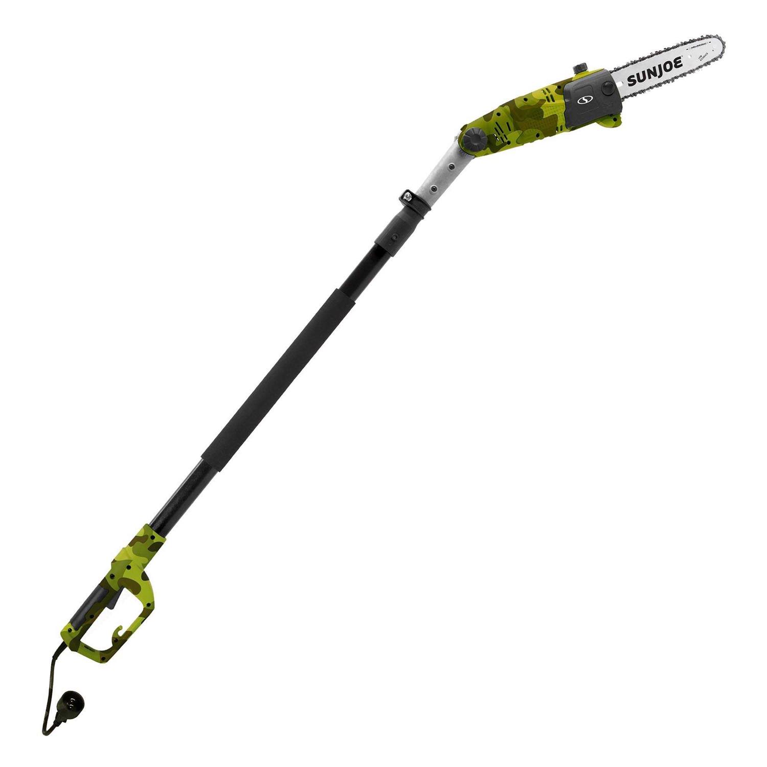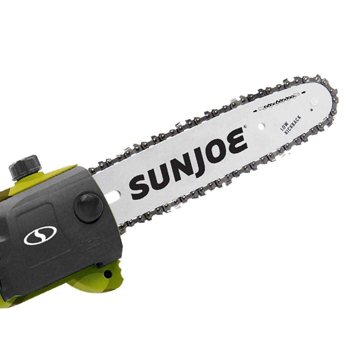 SAW WHAT YOU SEE! Tackle those hard-to-reach brancheswith ease. The Sun JoeSWJ803E electric pole chainsaw takes the danger and difficulty out of trimming your overgrowntrees. Stand safely on solid ground and simply adjust SWJ803E’s telescoping pole to gain up to 14feet of overhead reach.Powered by a robust 8-amp motor, the SWJ803E’s multi-anglehead can handle the most stubborn tree limbs up to 9.5-inchesthick. It features a durable, 10-inch Oregon bar and chain withan auto-oiler to keep the bar and chain fully lubricated duringuse. Unlike gas-powered tools, SWJ803Eis powered electrically,so you’ll reliably power up with the push of a button withouthaving to deal with smoke, fumes, unpredictable startersor costly tune-ups. Plus the SWJ803E comes equipped witha built-in safety switch to preventaccidental starting.