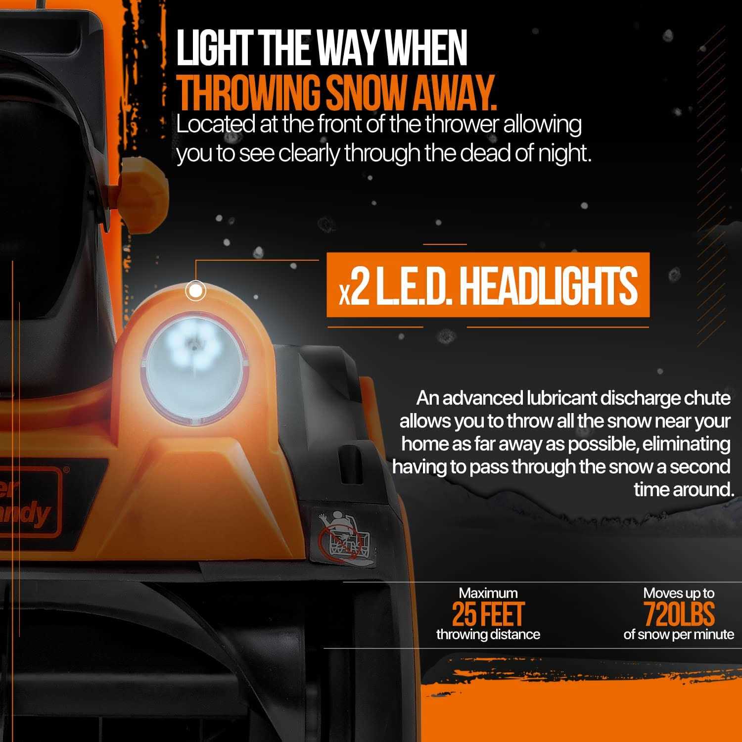 A walk-behind snow thrower powered by a corded AC 120V-15A. It offers a 45.7cm x 25.4cm clearing area, can throw snow up to 7.6m, and has a 326kg/min capacity. It also features LED headlights, making it perfect for driveways, paths, and yards.